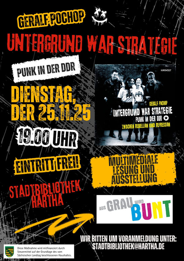 25.11.2025 Hartha multimediale Lesung ""Untergrund war Strategie"" + Zeitzeugengespäch + Ausstellung "Aus Grau wird Bunt" in der Bibliothek (gefördert von Weltoffenes Sachsen)