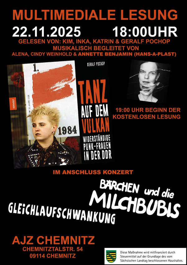 22.11.2025 Chemnitz Buchveröffentlichungs-Veranstaltung zum Buch "Tanz auf dem Vulkan. Widerständige Punk-Frauen in der DDR" mit drei damaligen Karl-Marx-Städter Protagonistinnen (KIM, INKA, KATRIN), musikalische Begleitung: Annette Benjamin (Hans-A-Plast), Cindy Weihnhold und Alena + Zeitzeugengespäche im AJZ Talshock (gefördert von Weltoffenes Sachsen), im Anschluß Konzert mit Bärchen und die Milchbubis & Gleichlaufschwankung