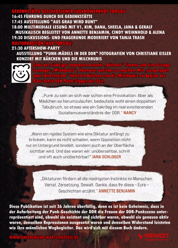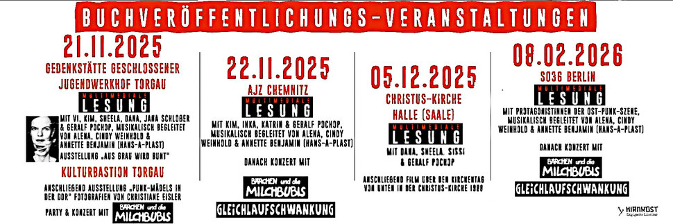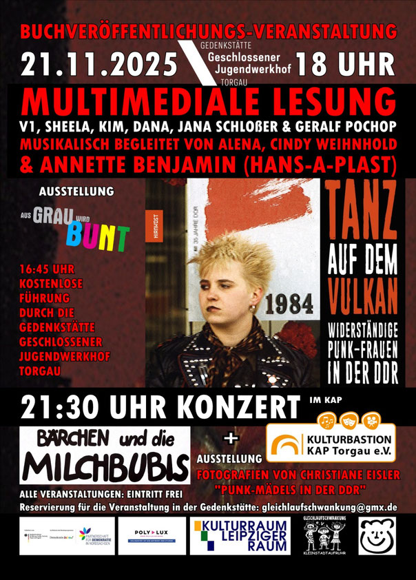 21.11.2025 Torgau Buchveröffentlichungs-Veranstaltung zum Buch "Tanz auf dem Vulkan - Widerständige Punk-Frauen in der DDR" mit vielen Protagonistinnen aus dem Buch, musikalische Begleitung: Annette Benjamin (Hans-A-Plast), Cindy Weihnhold und Alena + Zeitzeugengespäche in der Gedenkstätte "Geschlossener Jugendwerkhof Torgau" (gefördert von Partenerschaften für Demokratie) Im Anschluß Party in der Kulturbastion (KAP), es spielen live Bärchen und die Milchbubis