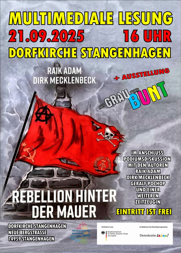 21.09.2025 Stangenhagen (Trebbin bei Beelitz) - 16 Uhr multimediale Lesung "Rebellion hinter der Mauer" + Zeitzeugengespäch mit Raik Adam, Dirk Mecklenbeck und Geralf Pochop in der Dorfkirche Stangenhagen, (gefördert von Partenerschaften für Demokratie)