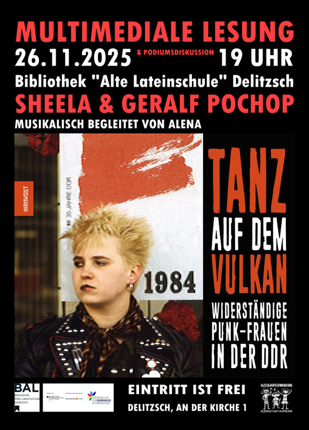 26.11.2025 Delitzsch multimediale Lesung "Tanz auf dem Vulkan. Widerständige Punk-Frauen in der DDR" + Zeitzeugengespäch in der Bibliothek (gefördert von Partnerschaften für Demokratie)