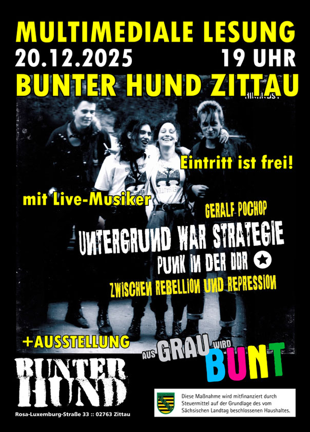 20.12.2025 Zittau multimediale Lesung ""Untergrund war Strategie"" + Zeitzeugengespäch + Ausstellung "Aus Grau wird Bunt" im Bunten Hund (gefördert von Weltoffenes Sachsen)