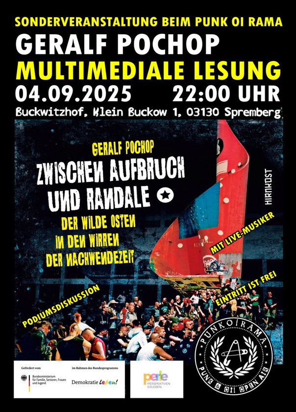 04.09.2025 Spremberg- 22 Uhr multimediale Lesung "Zwischen Aufbruch und Randale" beim Punk Oi Rama Festival (gefördert von Partnerschaften für Demokratie)