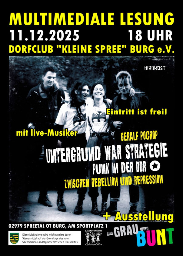 11.12.2025 Spreetal OT Burg multimediale Lesung ""Untergrund war Strategie"" + Zeitzeugengespäch + Ausstellung "Aus Grau wird Bunt" im Dorfclub "Kleine Spree" Burg e.V. (gefördert von Weltoffenes Sachsen)